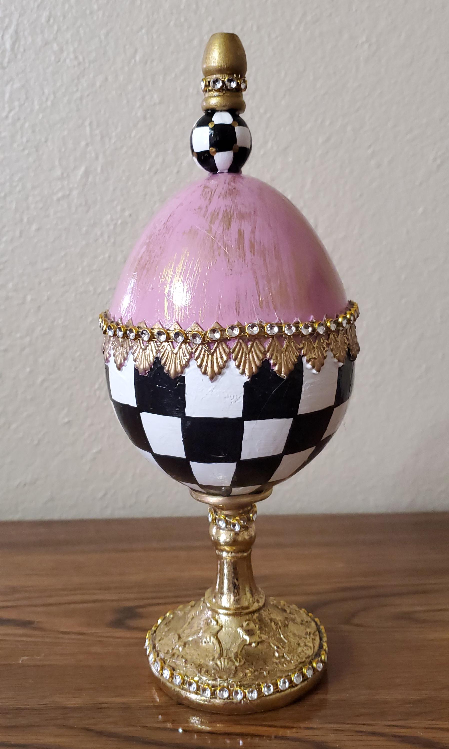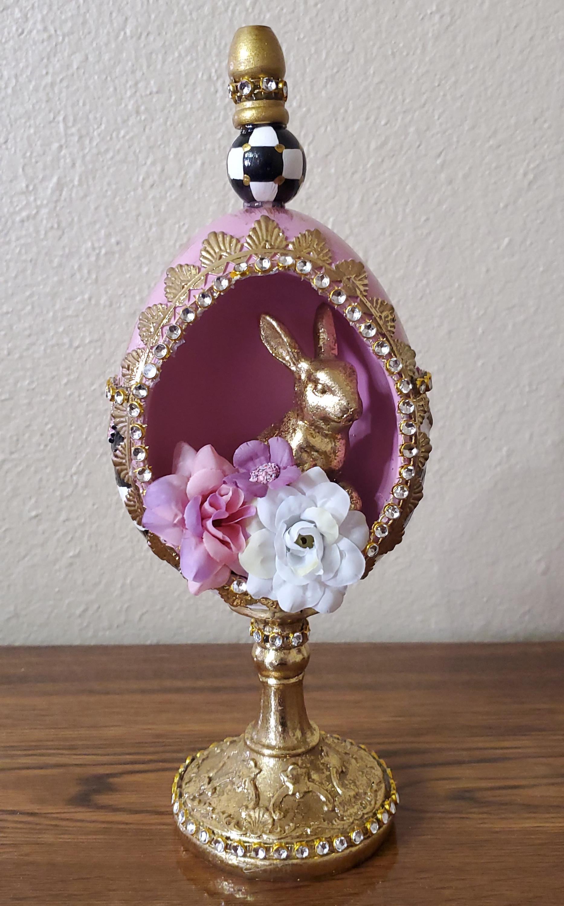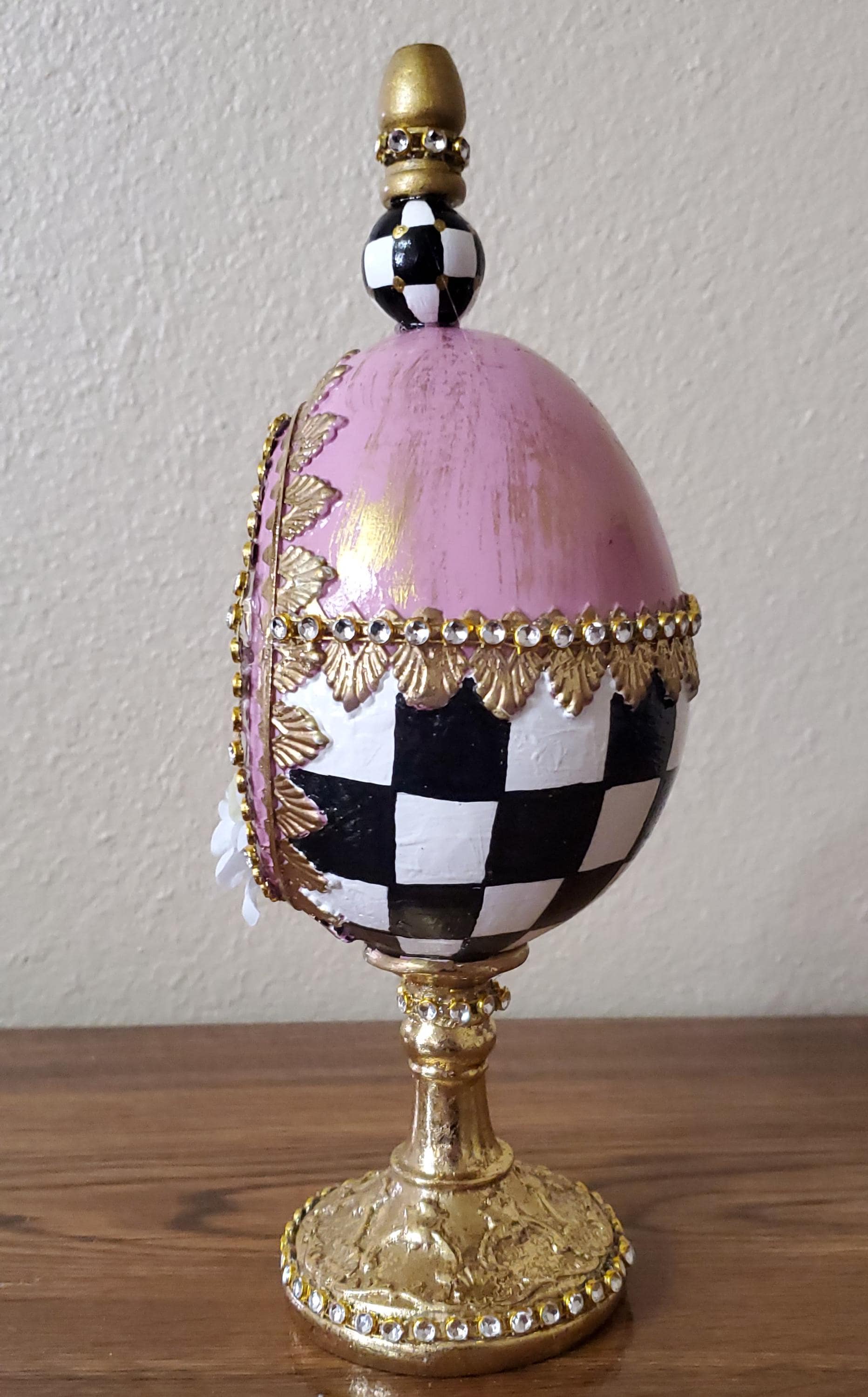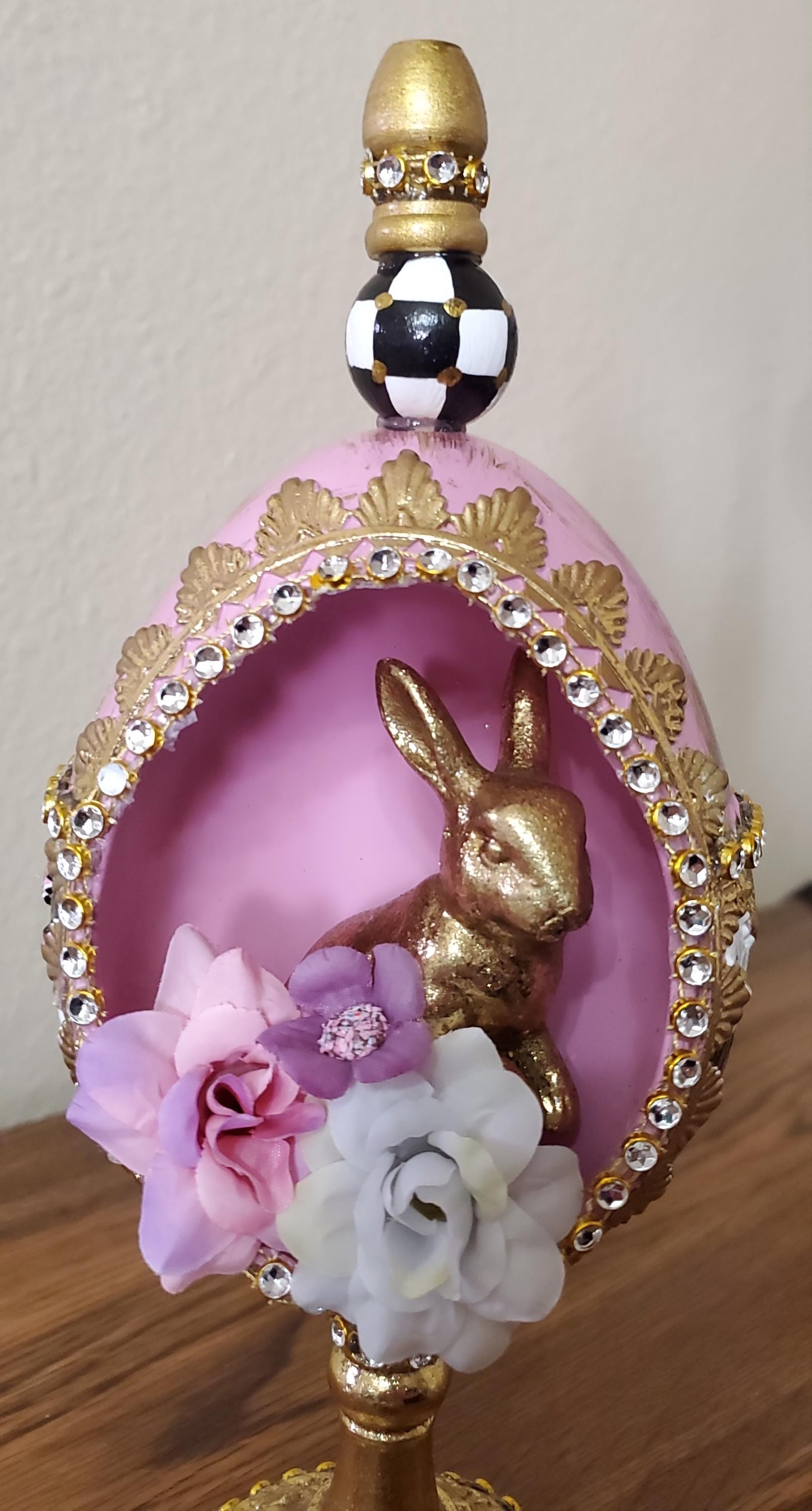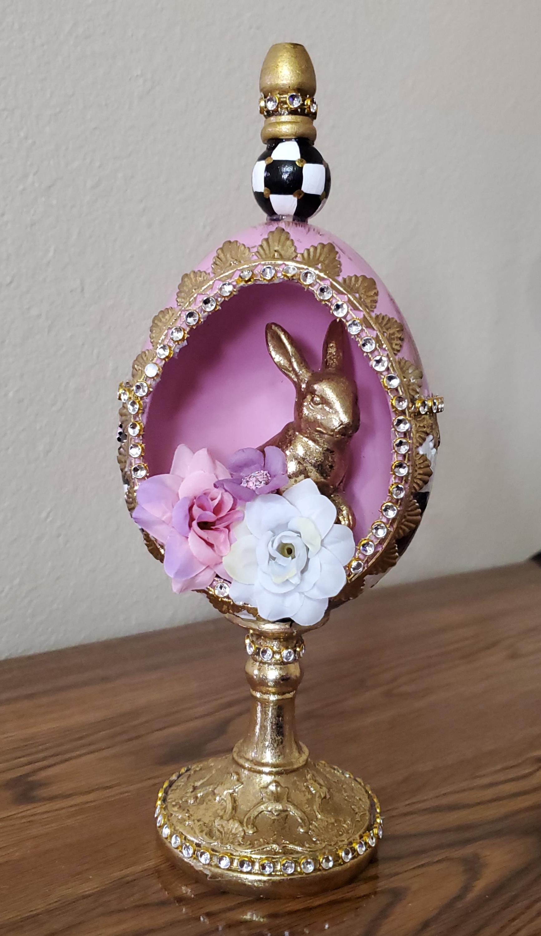 This hand painted diorama egg has pink, gold and in a black/white check pattern. A candle stick is painted in gold, black and white. Lots of gold jewel was used to decorate the outside of the egg, sitting inside is a sweet bunny popping out of the egg.