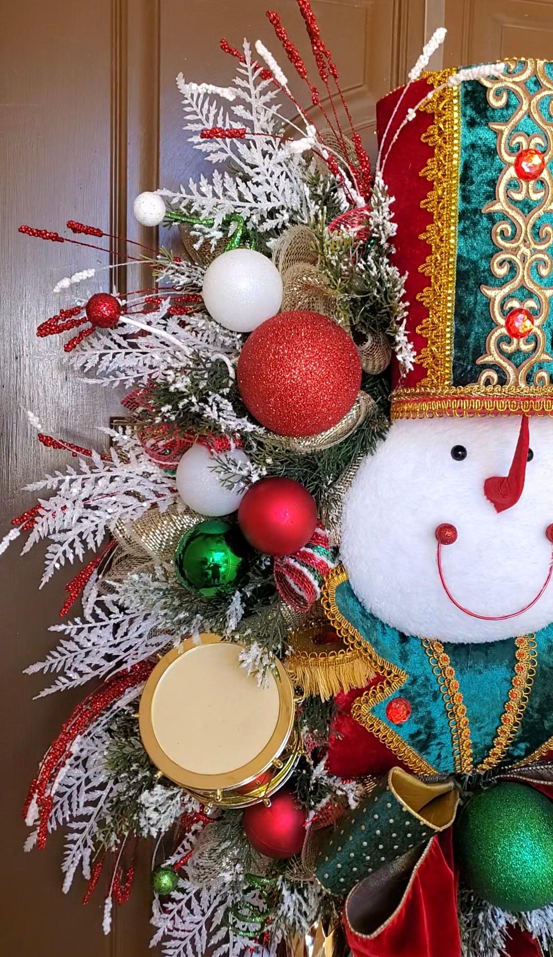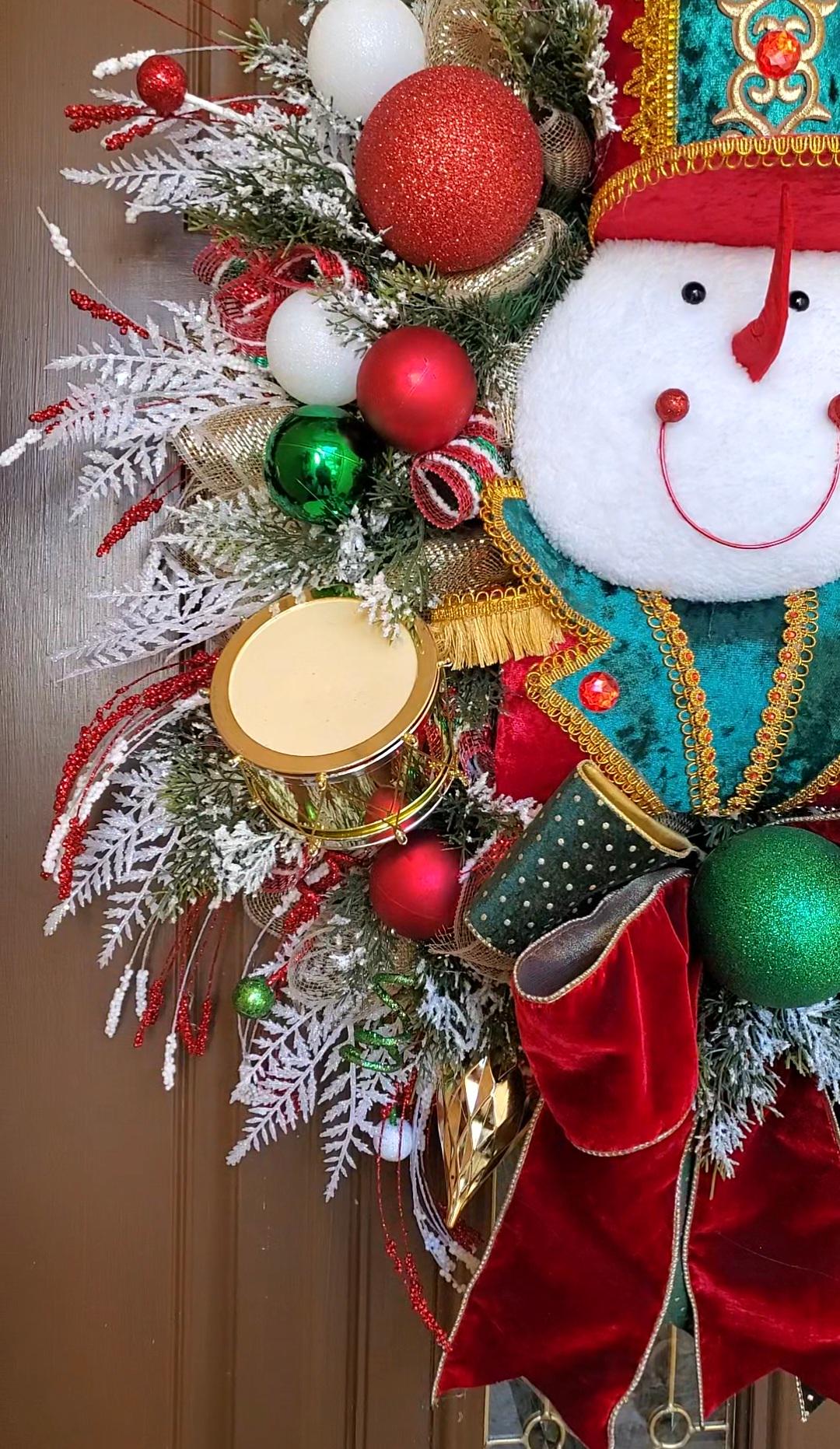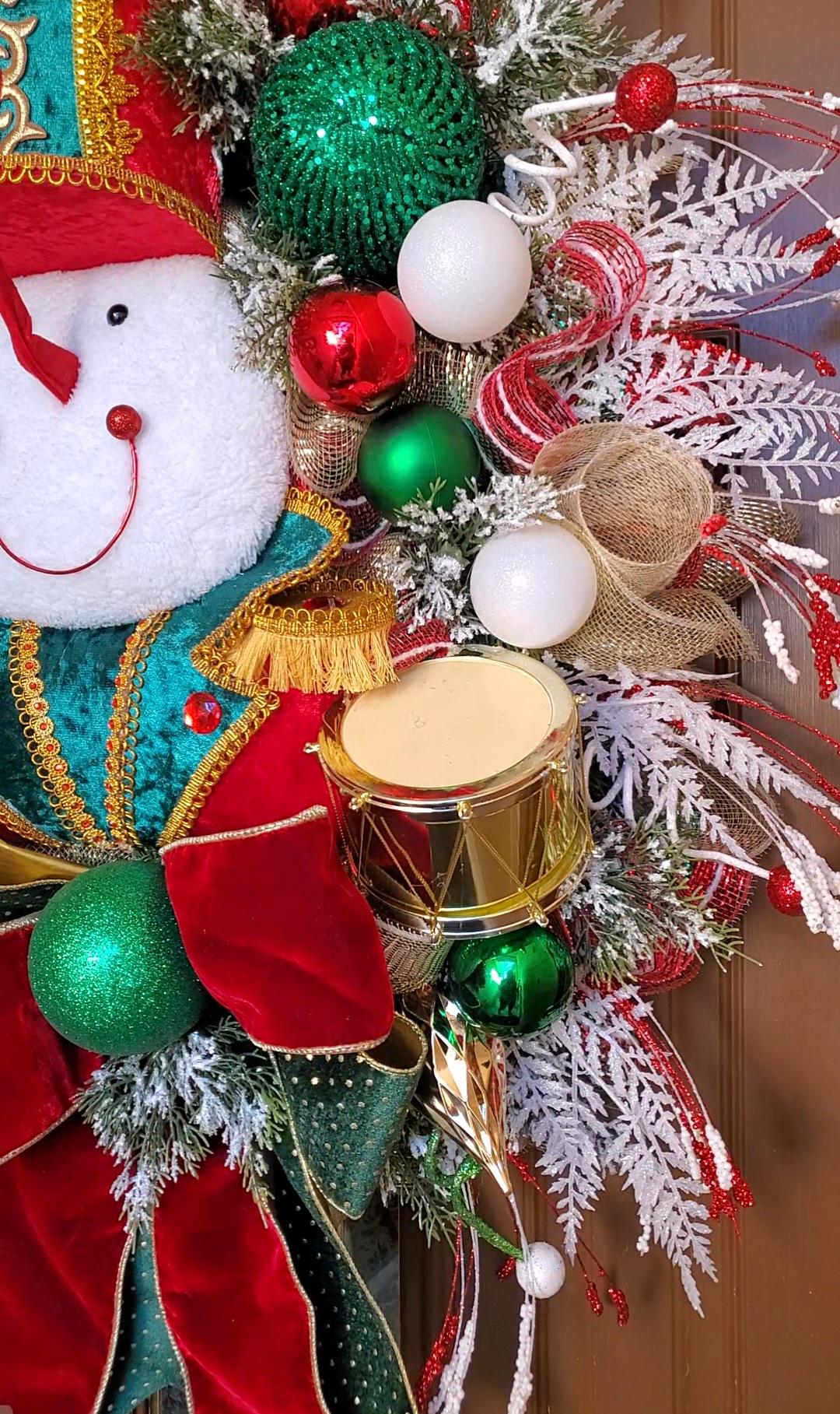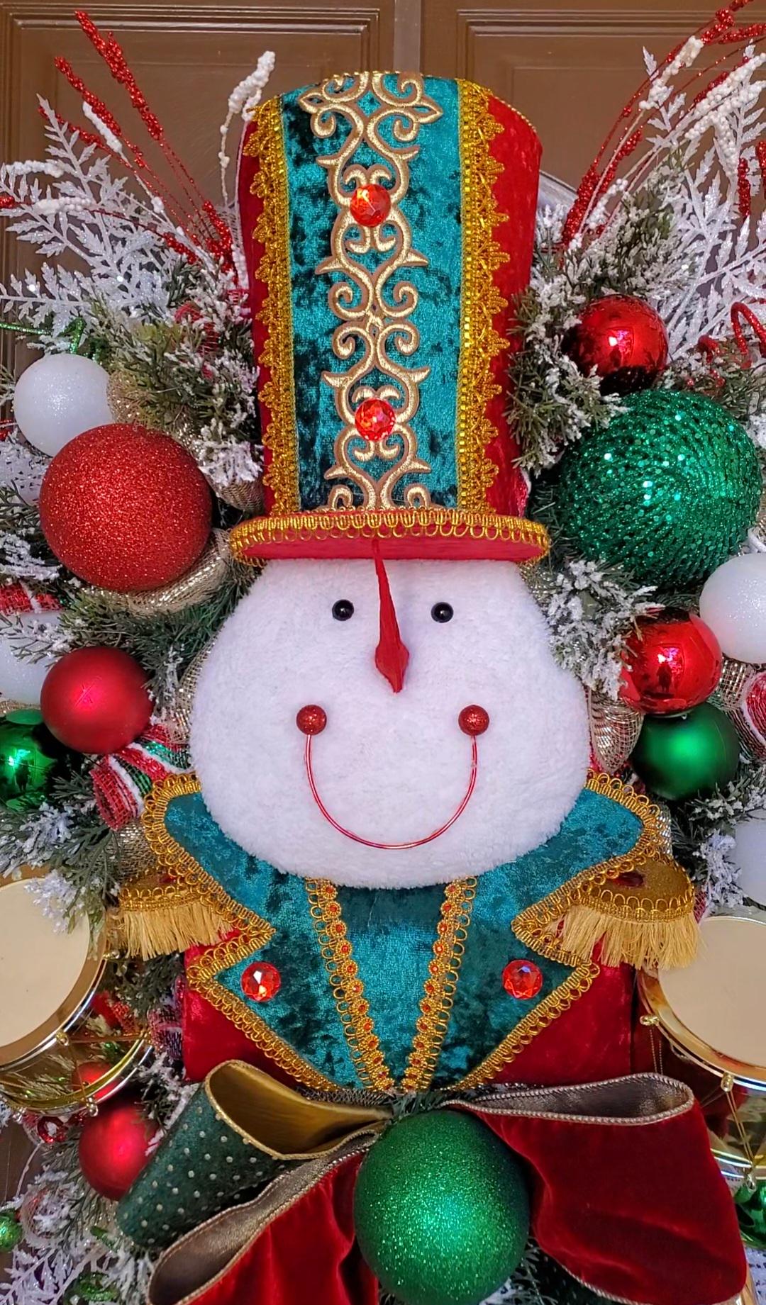 Elegant Snowman Nutcracker wreath is surrounded by his drum with ornaments, and Christmas picks. A large bow using designer ribbon.