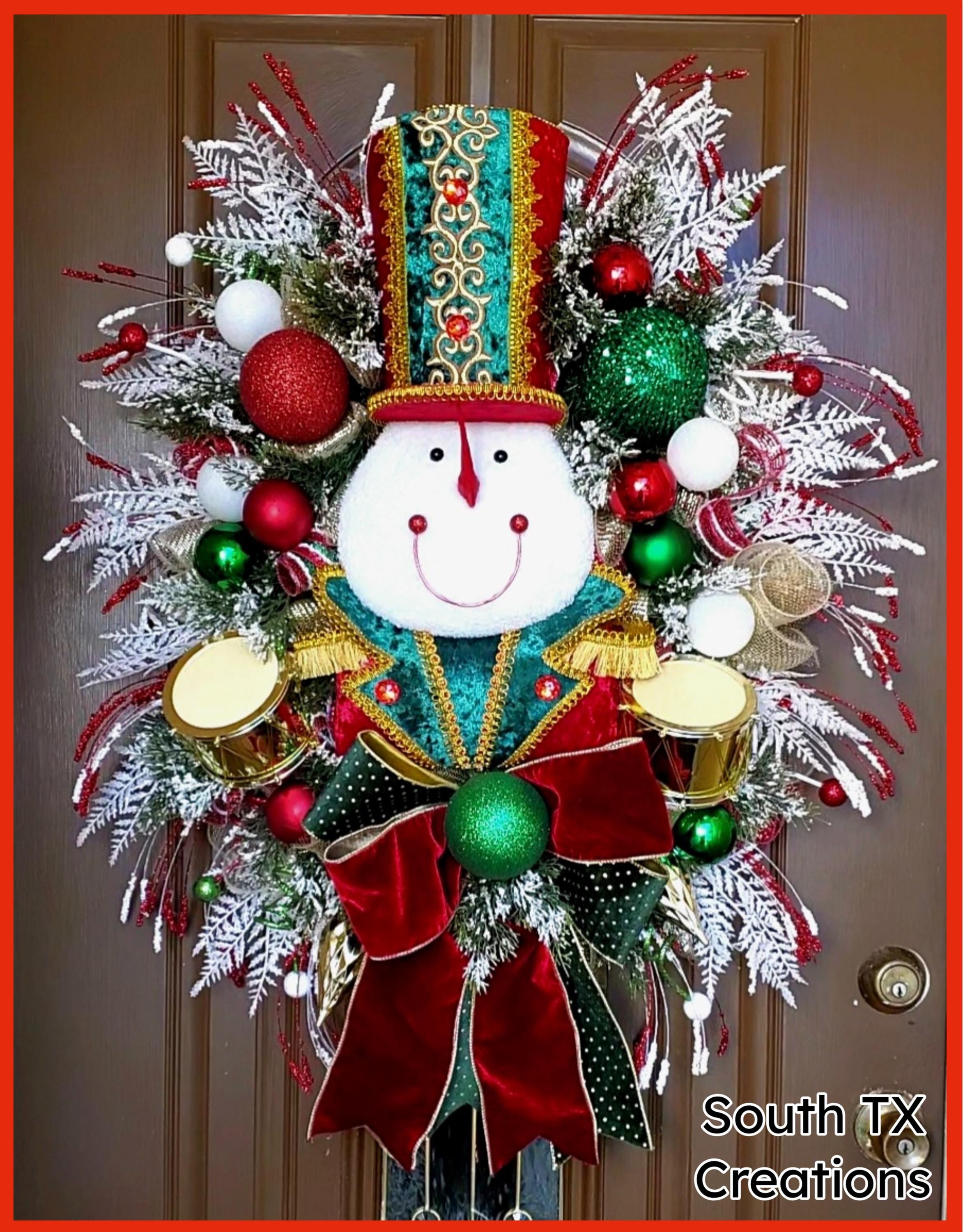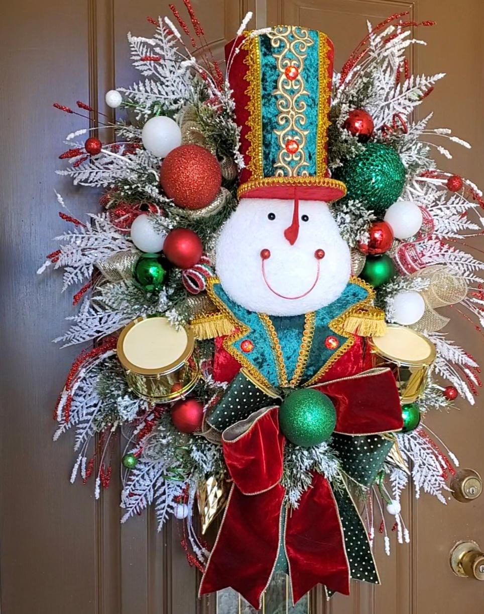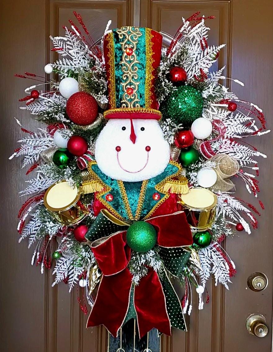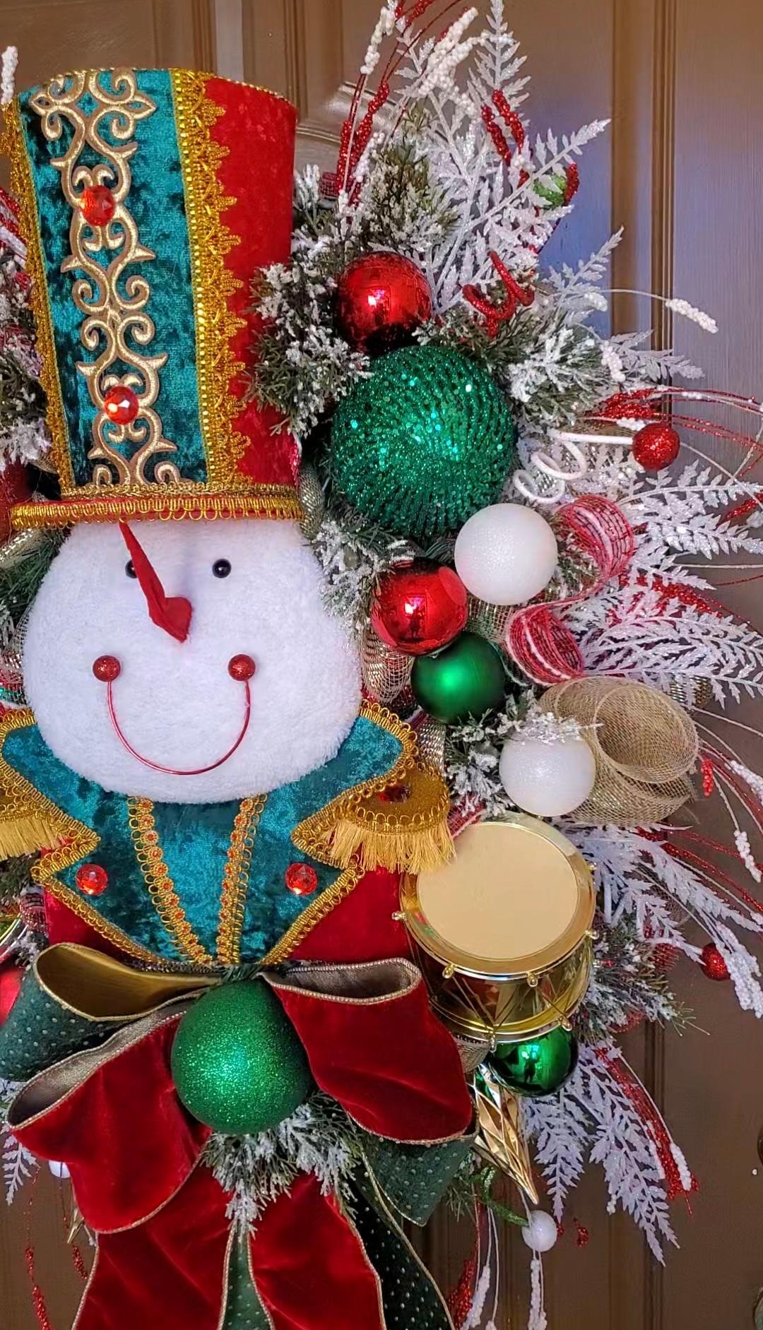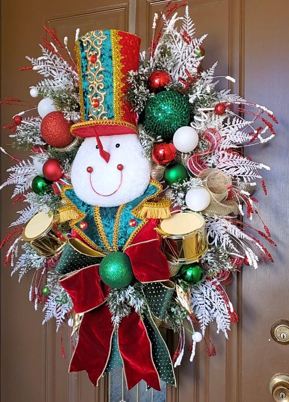 Elegant Snowman Nutcracker wreath is surrounded by his drum with ornaments, and Christmas picks. A large bow using designer ribbon.